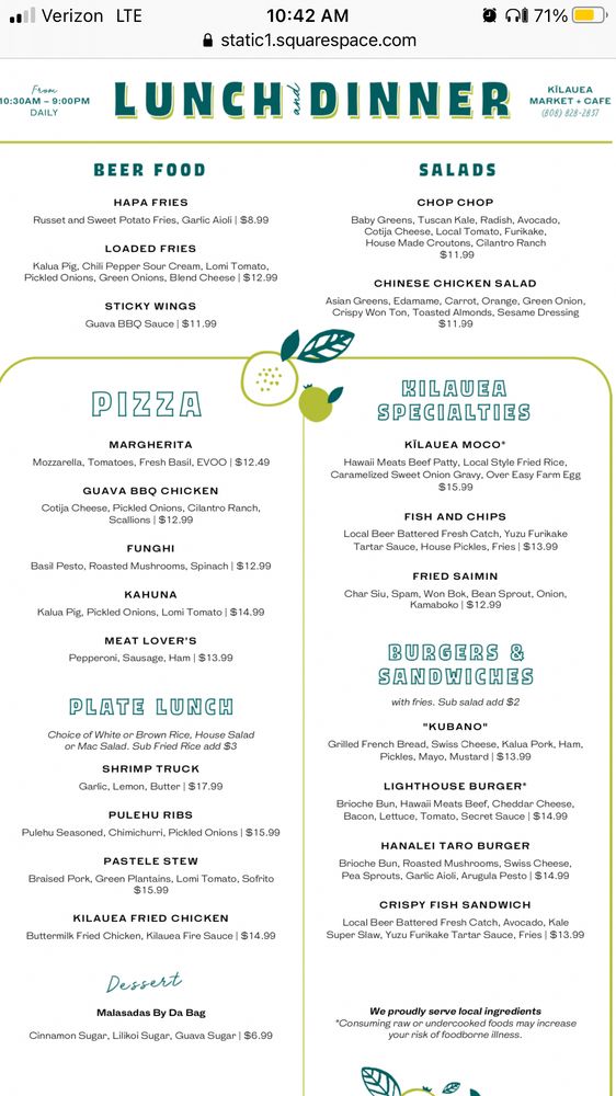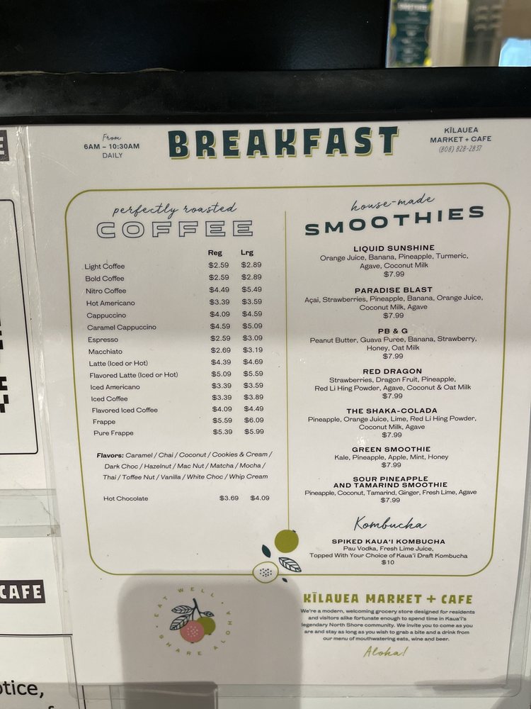 Welcome to Kilauea Market + Cafe, a must-visit breakfast and brunch haven nestled in the beautiful Kilauea, Kauai. This cafe, located at 2555 Ala Namahana Pkwy B1, showcases a delightful menu that promises both flavor and affordability. Guests rave about their experience, with many highlighting the Kamaaina Breakfast and the scrumptious Poke Bowl as standout dishes. The breakfast options are noted for their generous portions and delightful twists, like the crispy-edged Korean-style fried eggs. For those seeking a quick treat, the lilikoi muffins offer a perfect snack. The cafe’s charming atmosphere, paired with fresh ingredients, makes each visit memorable. Customers appreciate the attention to quality while being aware of the staff's outstanding service, even during busy times. Whether you're grabbing a bold coffee or indulging in a croissant sandwich, Kilauea Market + Cafe is a culinary gem not to be missed.